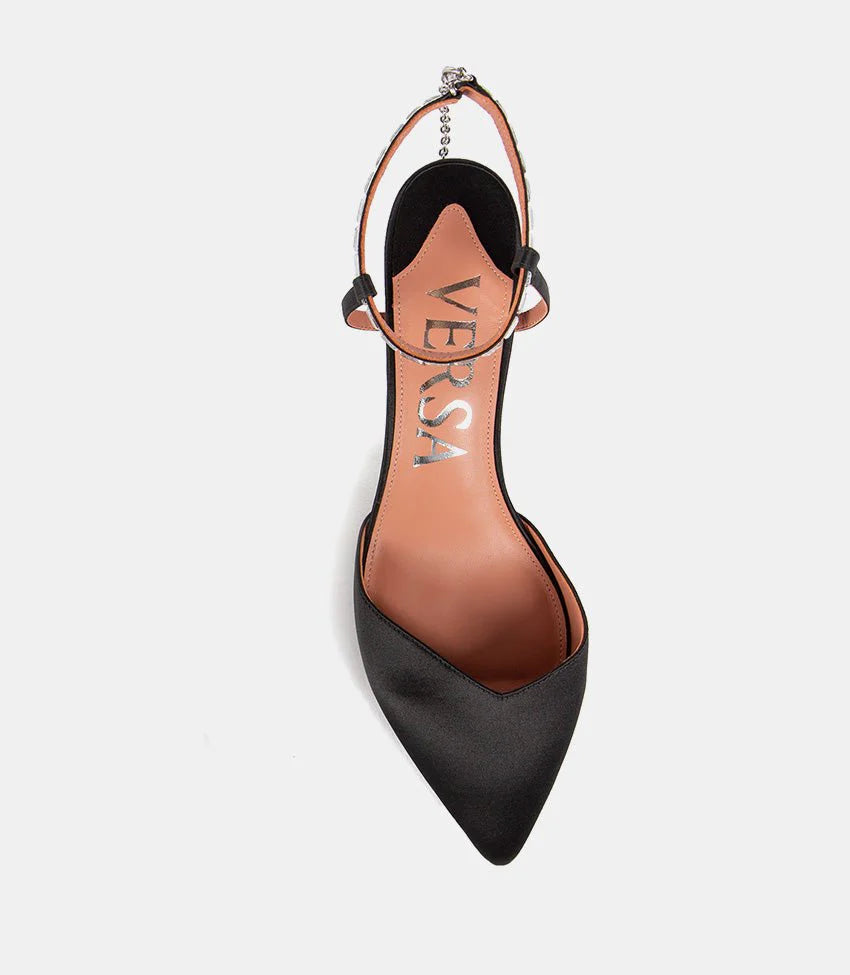 Um sapato de seda deslumbrante com um toque VICE VERSA. Este elegante scarpin de bico fino  apresenta uma tira suspensa de cristais no tornozelo e palmilha acolchoada. Confeccionado artesanalmente em seda, este scarpin é o sapato perfeito para o dia a dia.